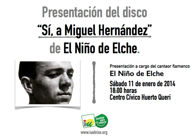 Miguel Hernández es uno de los poetas mas influyentes del siglo XX y que sufrió la represión franquista, muriendo en una cárcel alicantina el 28 de marzo de 1942, con 31 años de edad. En 2014 se cumplen 72 años de su muerte y queremos recordarlo como se merece, con un autor flamenco, de su tierra, El Niño de Elche. La presentación tendrá lugar el próximo sábado 11 de enero de 2014 a las 18 horas en el Centro Cívico Huerto Queri.